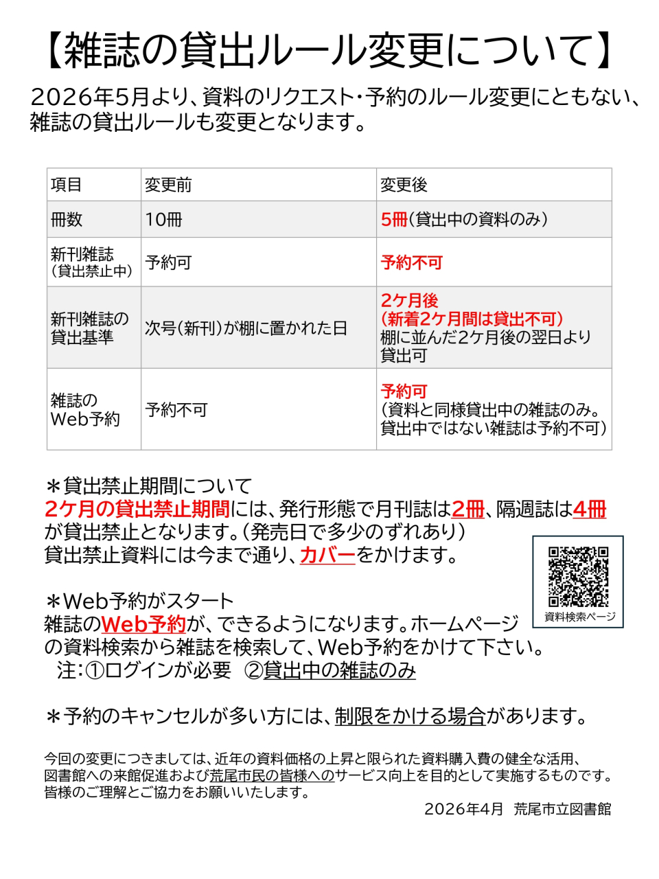 荒尾市と熊本市は図書館サービスの協定を締結し、2025年4月1日から双方の住民が図書館などで本の貸出ができるようになりました。※荒尾市民が熊本市内の図書館の本の貸出を行う場合には、初めに熊本市内の図書館などで住所の確認ができる証明物(運転免許証、保険証、マイナンバーカード等)を持参し、熊本市内図書館の「図書館カード」を作成する必要があります。